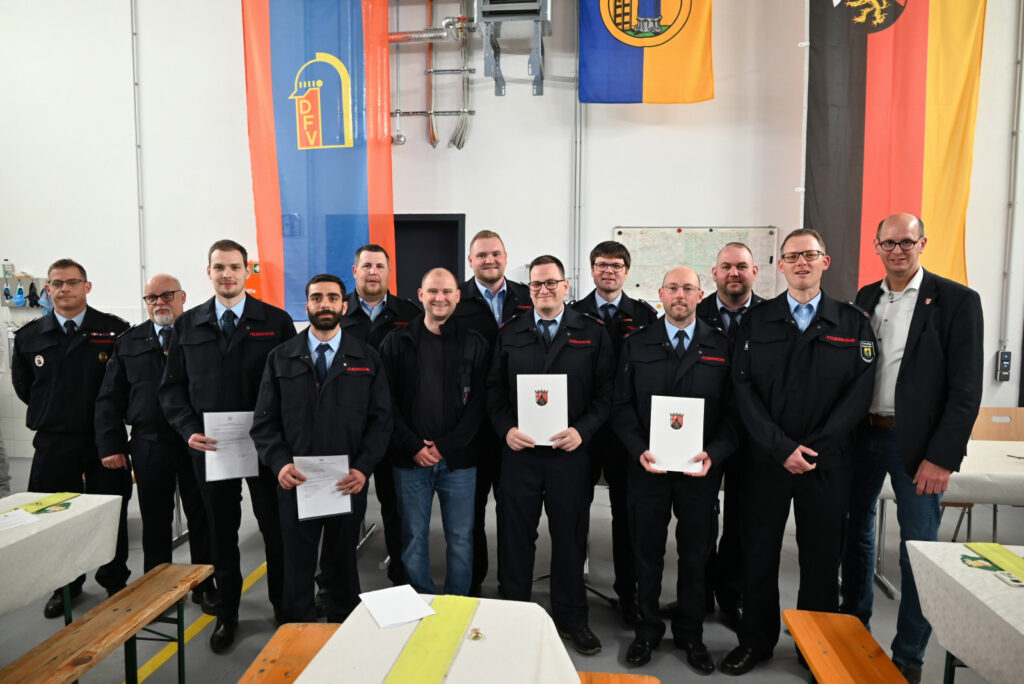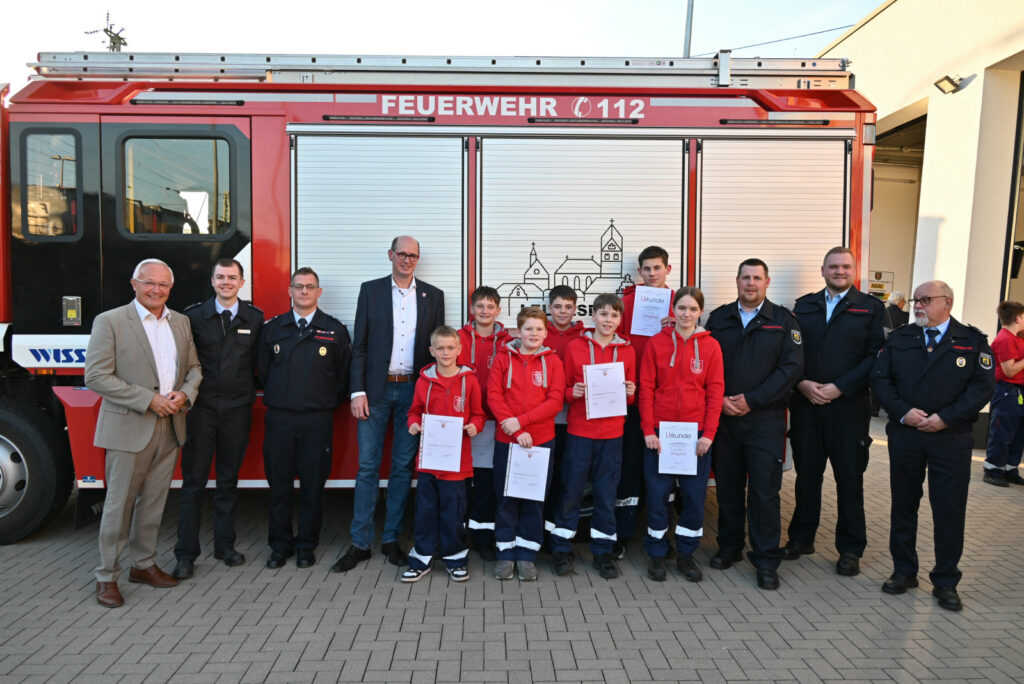 Ein zentraler Bestandteil des Abends waren Neuaufnahmen, Verpflichtungen, Ernennungen und Ehrungen. In die Jugendfeuerwehr wurden Jan Adams, Tom Blum, Sebastian Höhl, Alessio Kerres und Nikolas Probst aufgenommen. Für besonderes Engagement erhielten Tim Loth und Lena Laumann aus den Händen von Kreisjugendfeuerwehrwart Jan-Eric Henn das Ehrenzeichen des Kreisjugendfeuerwehrverbandes.
