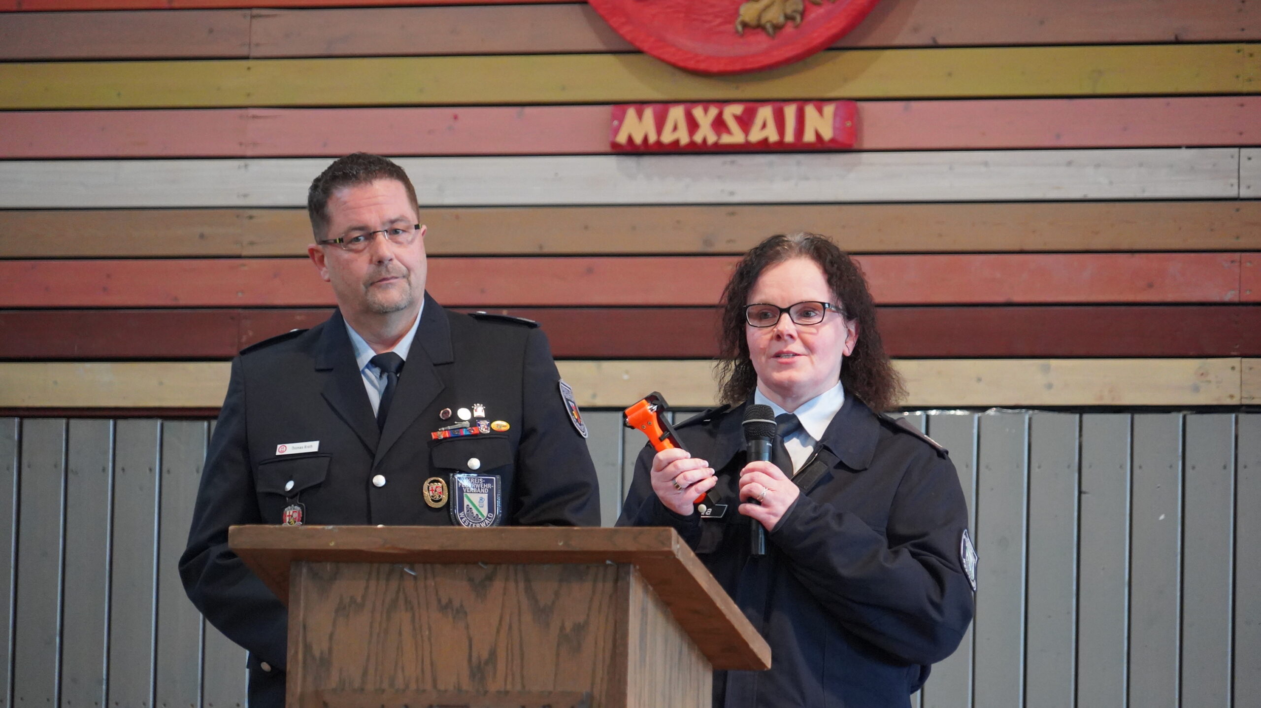 Auch Vertreter des Kreisfeuerwehrverbandes Westerwald richteten Grußworte an die Feuerwehr. Alexandra Zeyda, 1. stellv. Vorsitzende des Kreisfeuerwehrverbandes Westerwald, überreichte im Namen des Verbandes einen Glashammer mit Gurtschneider. „Ich hoffe, dass dieses Geschenk nie zum Einsatz kommen muss. Noch mehr hoffe ich, dass ihr von allen Einsätzen gesund zurückkehrt“, sagte Zeiler.